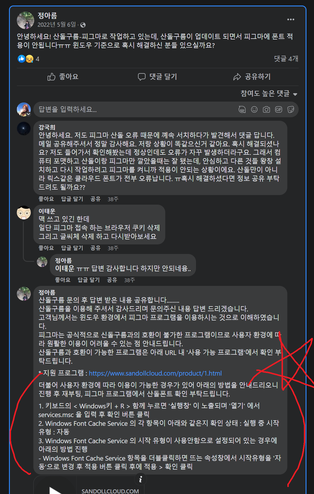 폰트 실행상태: 실행중, 시작유형:자동 으로 되어있는 지 확인하고 되어있다면